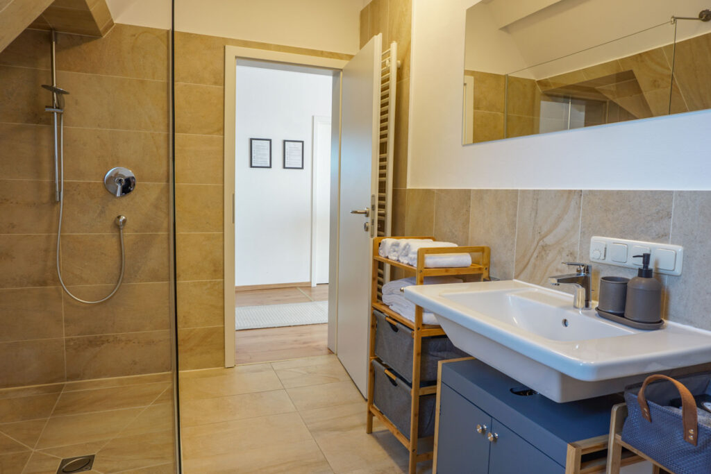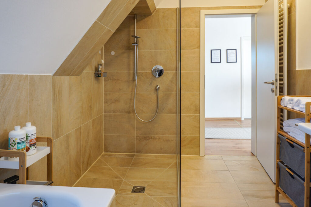 Modernes Bad mit Badewanne und DuscheGegenüber der Küche liegt das moderne und frisch sanierte Bad, dass über eine ebenerdige große Dusche, eine Badewanne und einen Waschtrockner mit Wickelstation verfügt. Wir stellen euch natürlich Handtücher, Badetücher, Waschlappen sowie Kosmetikprodukte zur Verfügung.