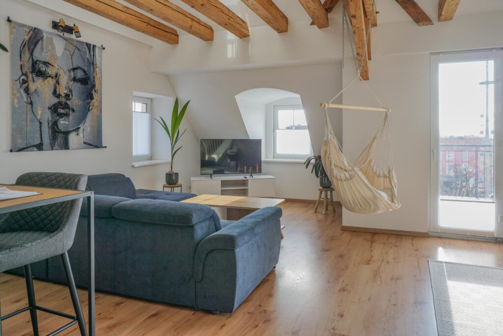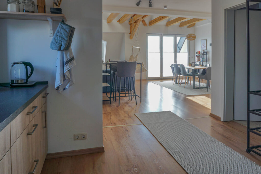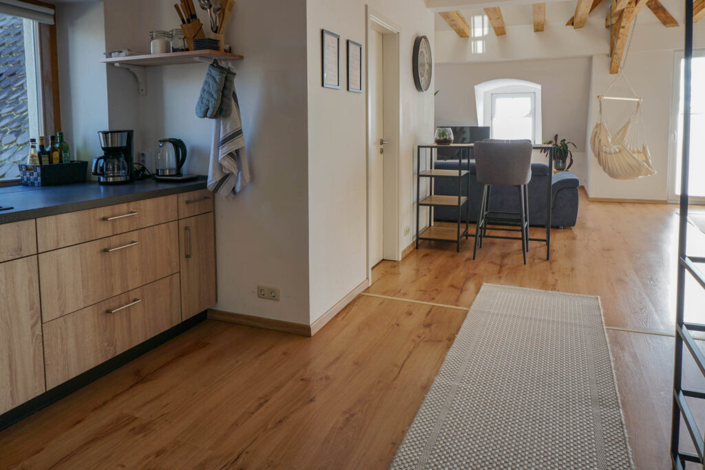 Perfekt für Familien und GruppenDas große Wohnzimmer wird durch seine bodentiefe Fensterfront zum Balkon den ganzen Tag mit warmen Licht durchflutet. Der helle Holzfußboden sorgt für zusätzliche Gemütlichkeit. Hier findet ihr eine große und komfortable Wohnlandschaft, die auch als Schlafsofa genutzt werden kann. Ein großer Flachbild-Fernseher mit Netflix läd zu geselligen Filmeabenden ein. An einem der original historischen Dachbalken könnt ihr es euch in einem stylischen Hängesessel gemütlich machen.