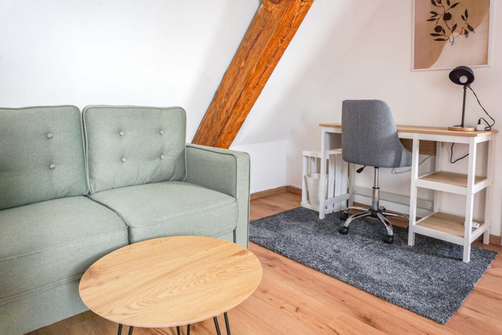 Falls doch mal gearbeitet werden mussAm praktischen Schreibtisch könnt ihr eure Arbeit erledigen. Oder ihr macht es euch einfach auf unserem gemütlichen Sofa gemütlich und beobachtet von hier oben den Trubel im Wohnzimmer.
