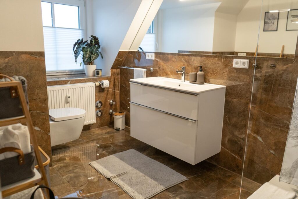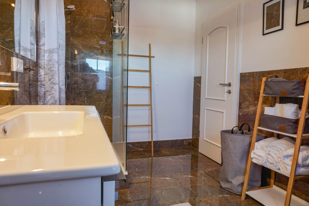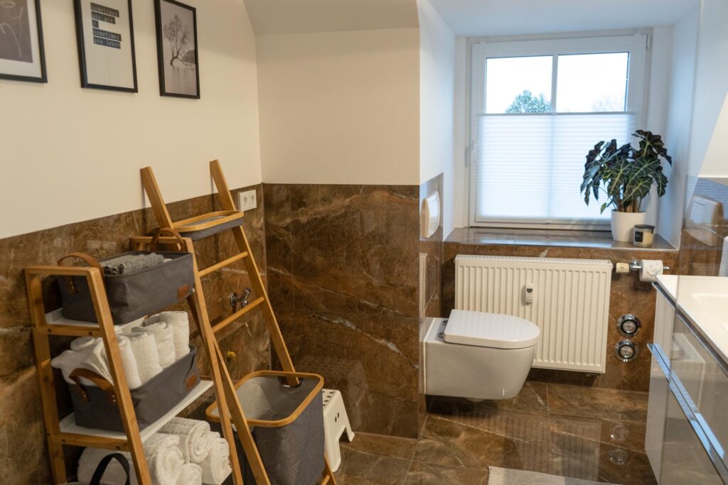 Neben dem Schlafzimmer liegt das moderne und frisch sanierte Bad in Marmoroptik, dass über eine Dusche mit Regenduschkopf und ein breites Waschbecken mit großem Spiegel verfügt. Wir stellen euch natürlich Handtücher, Badetücher, Waschlappen sowie Kosmetikprodukte zur Verfügung.