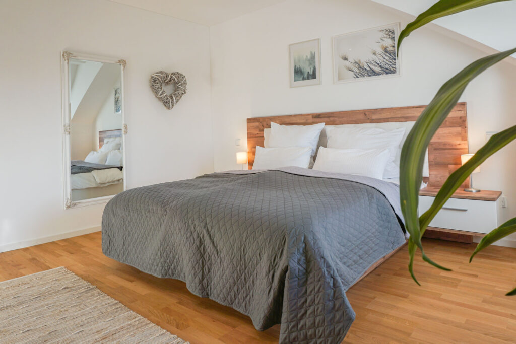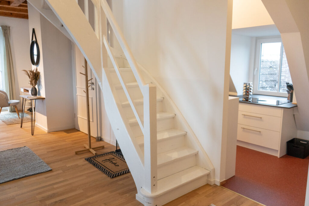 Neben der Küche befindet sich die historische Treppe hinauf zum zweiten Schlafzimmer. Direkt unterm Dach mit Blick auf die Sterne könnt ihr hier mit bis zu 4 Personen in 2 gemütlichen Doppelbetten (180x200cm) schlafen.