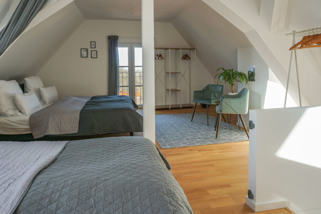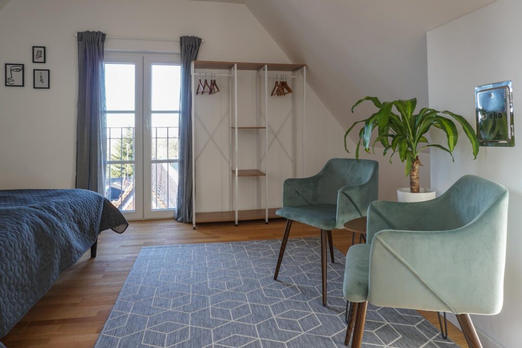 Auch hier habt ihr in den zwei offenen Kleiderschränken genug Stauraum für eure Kleidung. Und die gemütliche Sitzecke lädt zum verweilen ein.