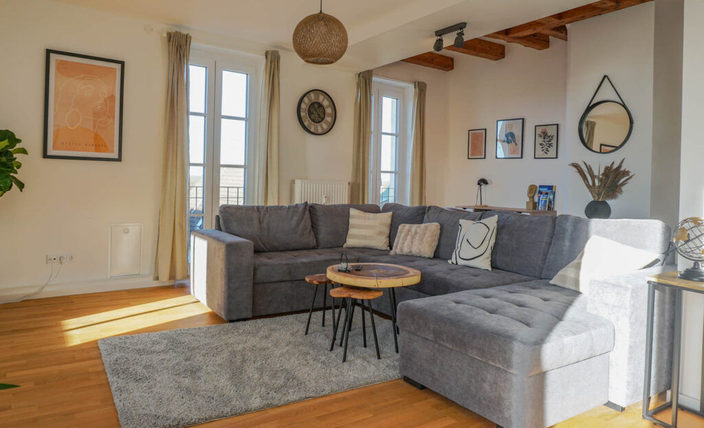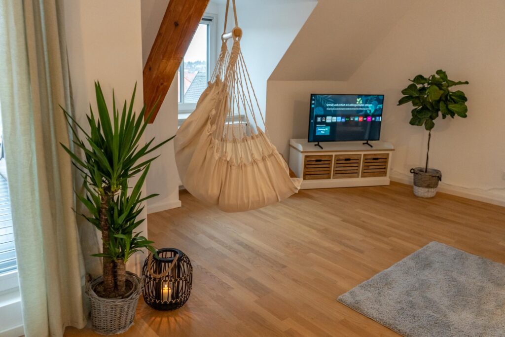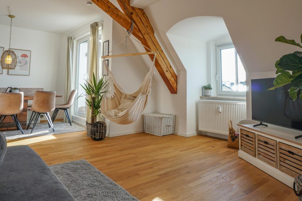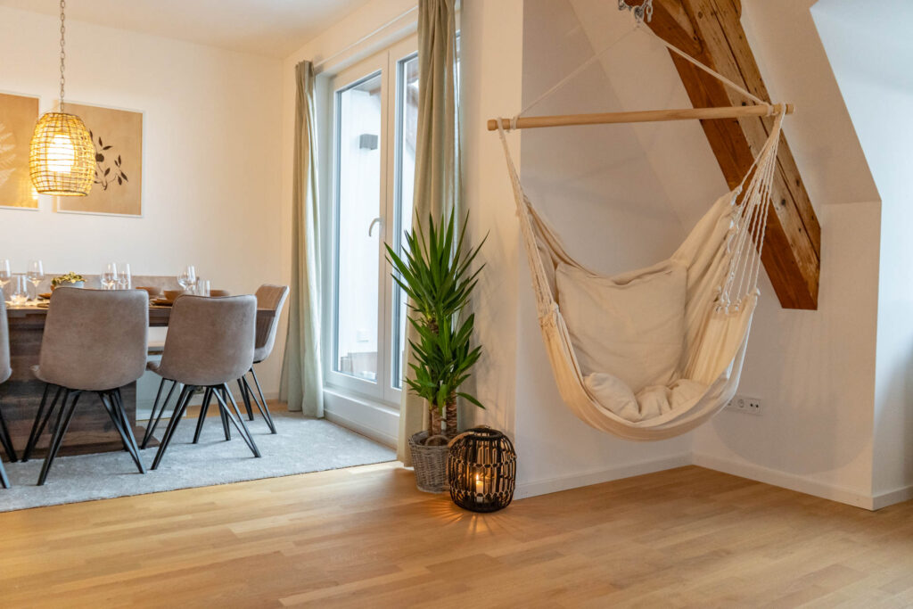 Das große Wohnzimmer wird durch seine bodentiefen Fenster den ganzen Tag mit warmen Licht durchflutet. Der helle Parkettboden sorgt für zusätzliche Gemütlichkeit. Hier findet ihr eine große und komfortable Wohnlandschaft, die auch als Schlafsofa genutzt werden kann. Ein großer Flachbild-Fernseher mit Netflix läd zu geselligen Filmeabenden ein. An einem der original historischen Dachbalken könnt ihr es euch in einem stylischen Hängesessel gemütlich machen.