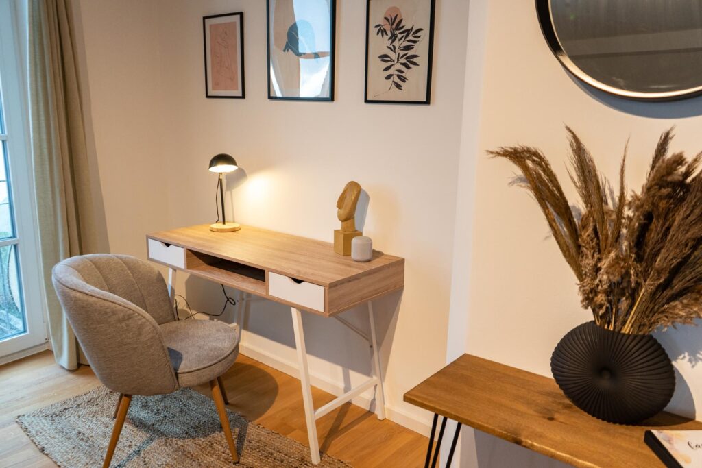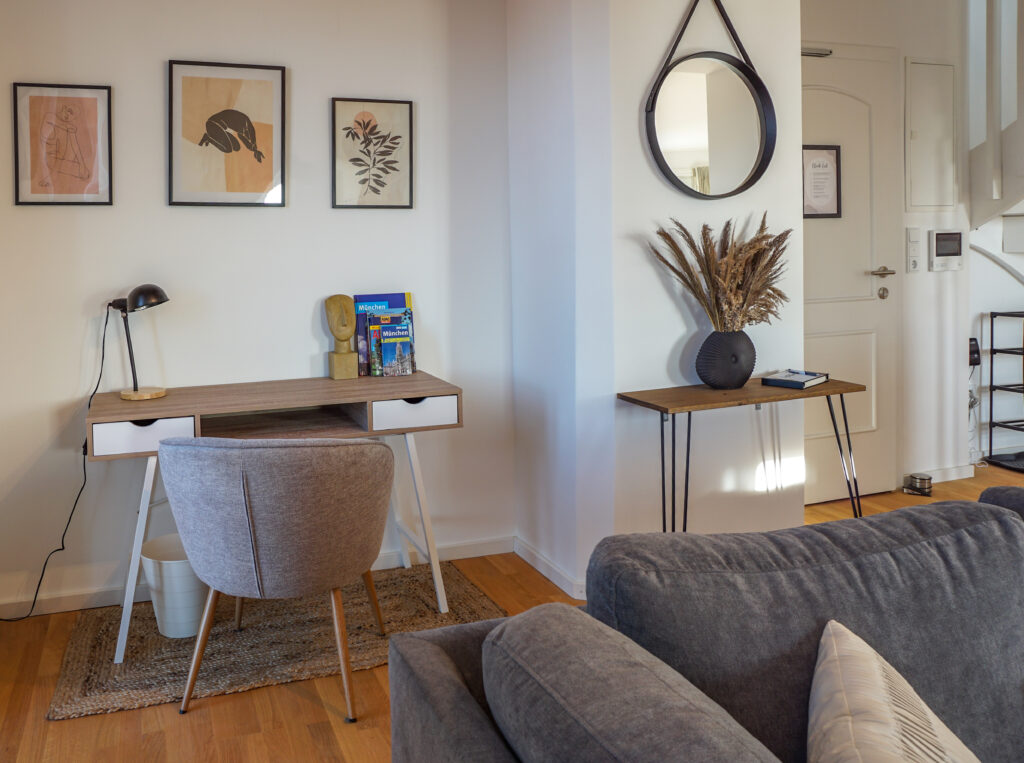 Am praktischen Schreibtisch könnt ihr eure Arbeit erledigen. Wir stellen eine große Auswahl an Büromaterialien bereit. Außerdem könnt ihr mit den bereitliegenden Reiseführern euren Aufenthalt noch besser planen.